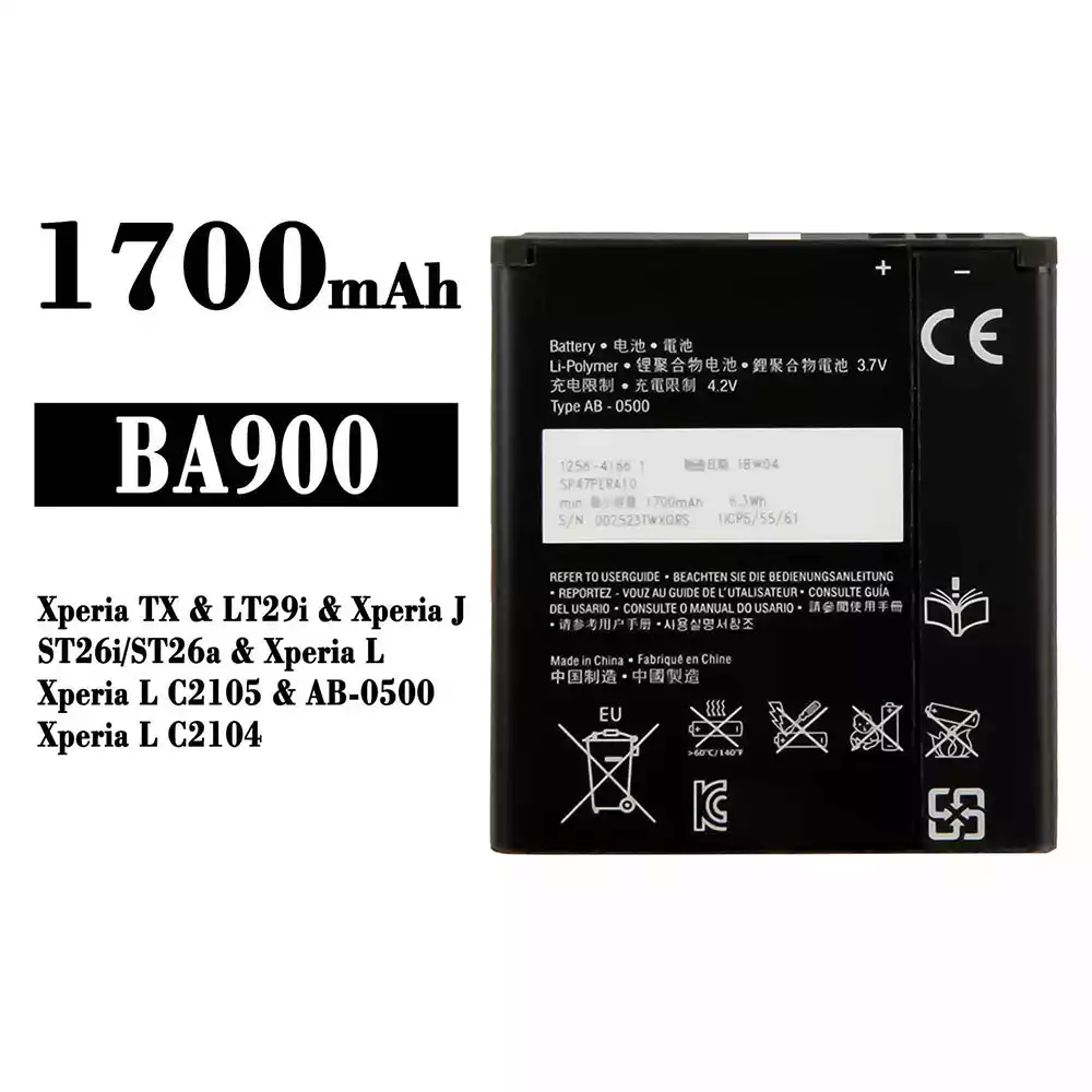 Battery model BA900 fits for Sony Xperia TX / LT29i / Xperia J / ST26i / ST26a / Xperia L / Xperia L C2105 / AB-0500 / Xperia L C2104
