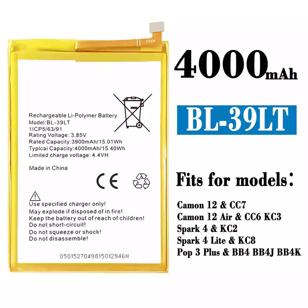 Battery model BL-39LT fits for Tecno Camon 12 / CC7 / Camon 12 Air / CC6 KC3 / Spark 4 / KC2 / Spark 4 Lite / KC8 / Pop 3 Plus / BB4 BB4J BB4K
