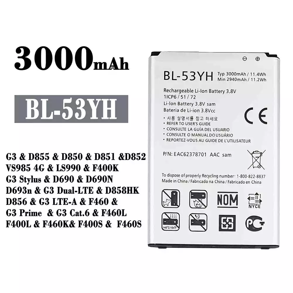 Battery model BL-53YH fits for LG G3 / D855 / D850 / D851 / D852 / VS985 4G / LS990 / F400K / G3 Stylus / D690 / D690N / D693n / G3 Dual-LTE / D858HK / D856 / G3 LTE-A / F460 / G3 Prime / G3 Cat.6 / F460L / F400L / F460K / F400S / F460S