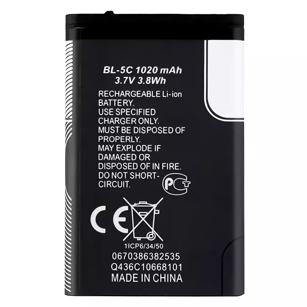 Battery model BL-5C fits for Nokia Nokia 1101 / 1100 / 1110 / 1110i / 1112 / 1200 / 1208 / 1280 / 1600 / 1650 / 2310 / 2600 / 2700 / 3100 / 3110 / 3120 / 5130 / 6030 / 6230 / 6230i / E50 / E60 / N70 / N71 / N72