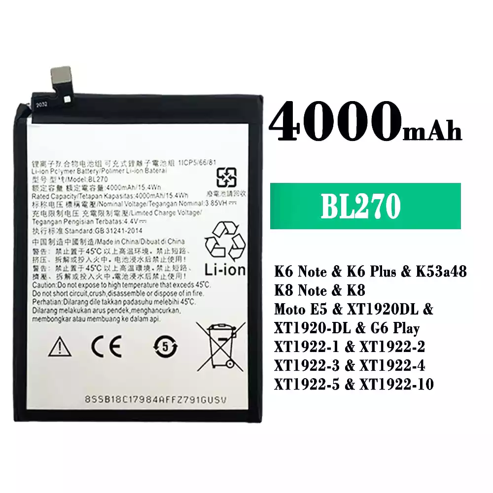 Battery model BL270 fits for Lenovo K6 Note / K6 Plus / K53a48 / K8 Note / K8 / Moto E5 / XT1920DL / XT1920-DL / G6 Play / XT1922-1 / XT1922-2 / XT1922-3 / XT1922-4 / XT1922-5 / XT1922-10