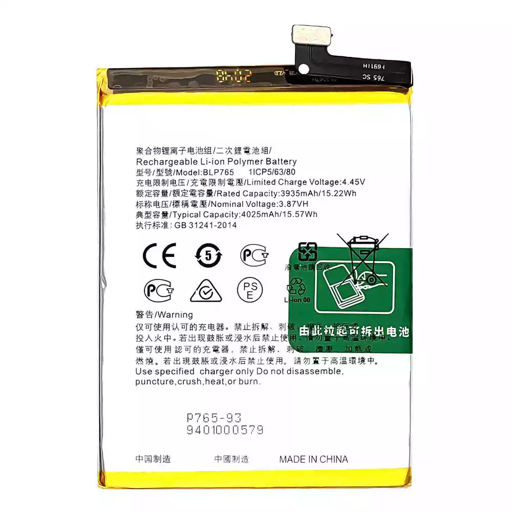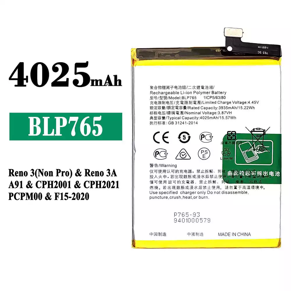 Battery model BLP765 fits for OPPO Reno 3(Non Pro) / Reno 3A / A91 / CPH2001 / CPH2021 / PCPM00 / F15-2020
