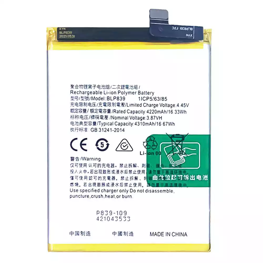Battery model BLP839 fits for OPPO A95 5G / A94 5G / Reno 5Z 5G / Reno 6Z / PELM00