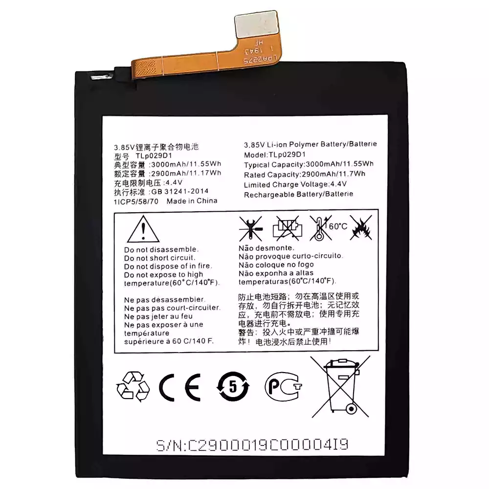 Battery model TLP029D1 fits for Alcatel 3 2018 / 0T-5052 / 5052D / 5052A / 5052Y / 5 / 0T-5086 / 5086D /5086Y / 5086A / 3L 2018 / OT-5034 / 3x 2018 / 0T-5058 / 50581 / 5058T / 5058Y / 5058A / 5058J